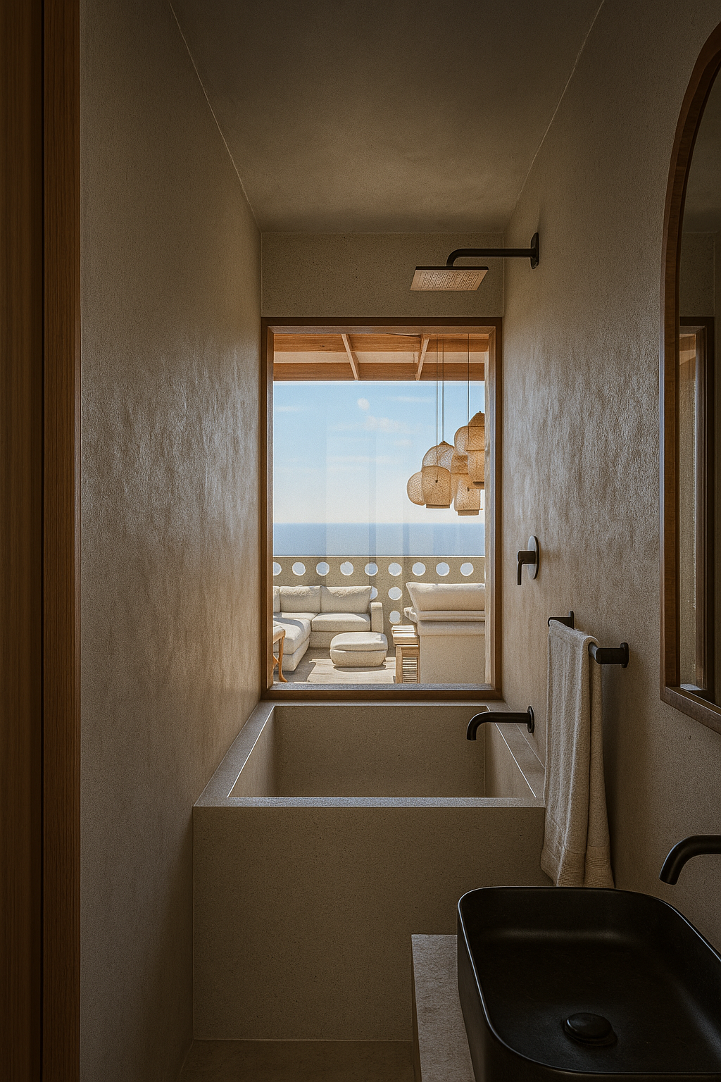 Positioned on elevated terrain, each of the three bedrooms — including the master ensuite with its custom made terrazzo bathtub — enjoys ocean views. The rooftop kitchen and sun deck with integrated BBQ offer panoramic views, making it an ideal space to entertain or unwind.