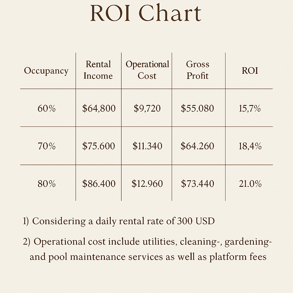 Based on a conservative average daily rate of $300 USD, the villas offer strong projected returns even in the most modest occupancy scenarios. Operational costs include housekeeping, pool and garden maintenance, utilities, and platform fees — all fully managed for hands-off ownership.